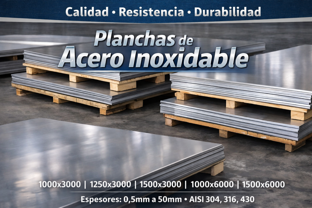 En Víctor Moroni líder en acero inoxidable encontrarás planchas de 1000×3000, 1250×3000, 1500×3000, 1000×6000 y 1500×6000 desde 0,5mm de espesor hasta 50mm en calidad AISI 304, 316, y 430 según terminación. Contáctanos aquí y cotiza o envíanos un correo a contacto@victormoroni.com